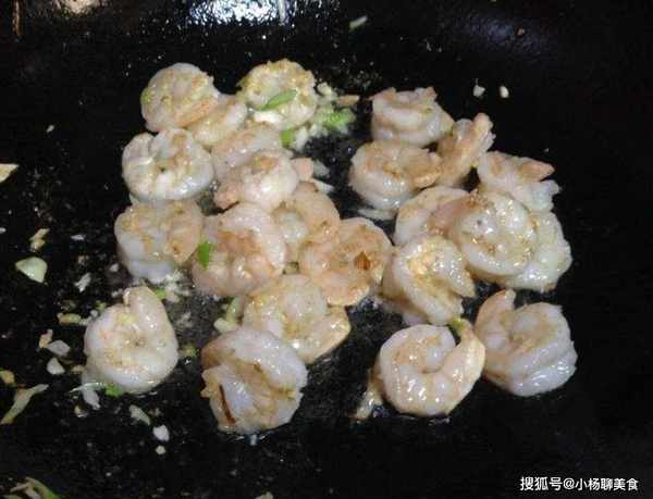 步驟五:起鍋熱油,油熟後放入蒜末,煸炒出香味,然後倒入蝦仁,翻炒到蝦仁變色。