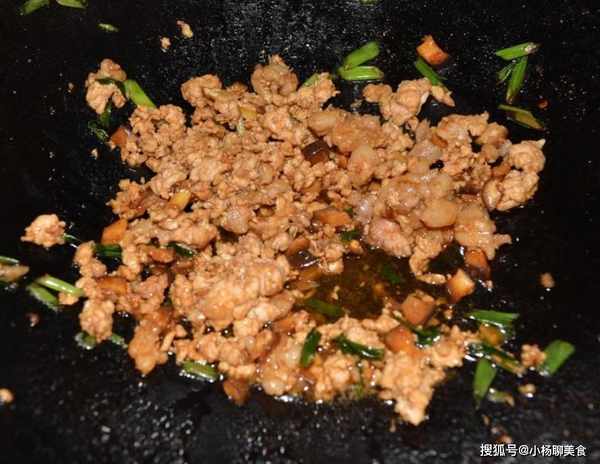 步驟四:然後倒入猪肉末,翻炒到變色,倒入適量醬油炒勻上色,繼續倒入一點點清水,一直熬煮到湯汁濃郁關火。