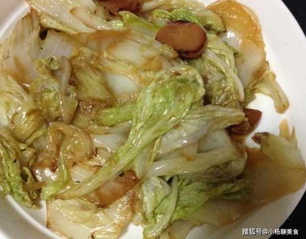 步驟五:繼續倒入白菜炒勻,然後倒入一點點清水,翻炒到白菜斷生變熟。