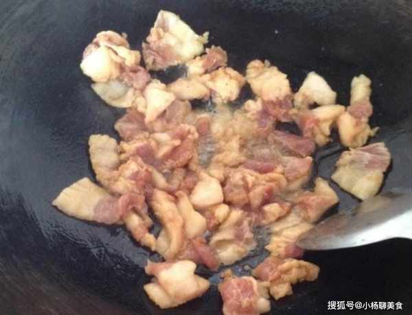步驟四:然後倒入猪肉,翻炒到猪肉變色,倒入適量醬油,炒勻上色。