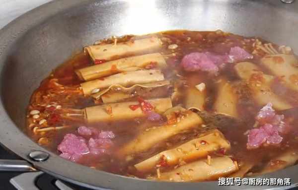 準備食材:金針菇500克,豆腐皮兩張,蕃茄1個,瘦肉300克,幹辣椒段少許,泡野山椒少許,薑末少許,蔥花少許,蒜末少許,生抽半勺,醬油一勺,蚝油一勺。