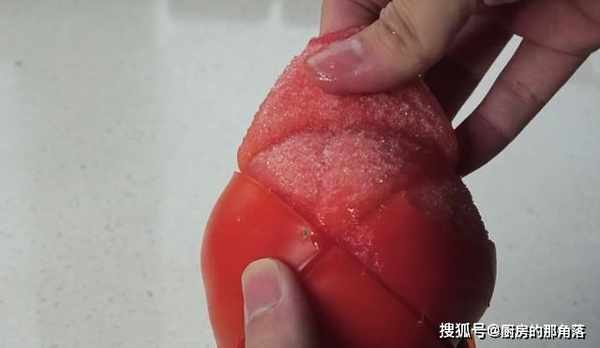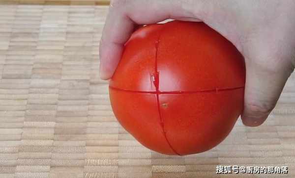 3.然後將準備好的蕃茄從頂部切十字花刀,放入熱水中燙五分鐘,然後再將其去皮切成小碎丁備用。(蕃茄在這裡的主要目的是為了熬制湯汁,所以我們需要將蕃茄的皮去掉。)