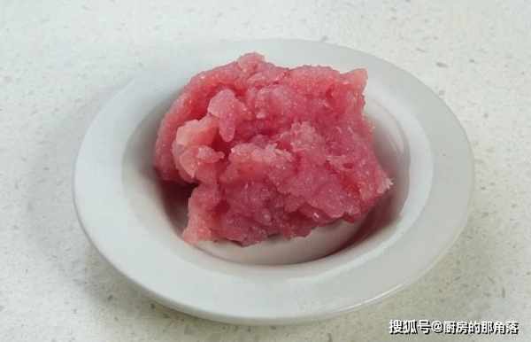 4.將準備好的五花肉切成碎丁,我這裡選擇的是精瘦肉,然後放入盤中備用。精瘦肉吃起來口感比較鮮嫩不油膩,大家也可以選擇肥七瘦三的五花肉,家裡沒有的也可以不用放。