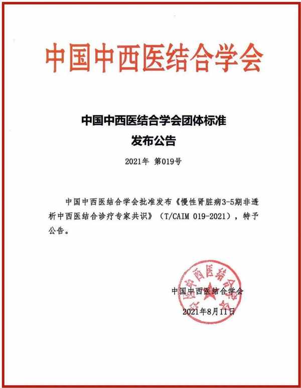 國家慢性腎臟病中醫臨床研究基地、廣東省中醫院腎病科和國家慢性腎病臨床醫學研究中心、中國人民解放軍總醫院腎內科共同起草的《慢性腎臟病3-5期非透析中西醫結合診療專家共識》團體標準(編號TCAIM 019-2021)在中國中西醫結合學會正式發佈,編寫組組長為陳香美院士和劉旭生教授。