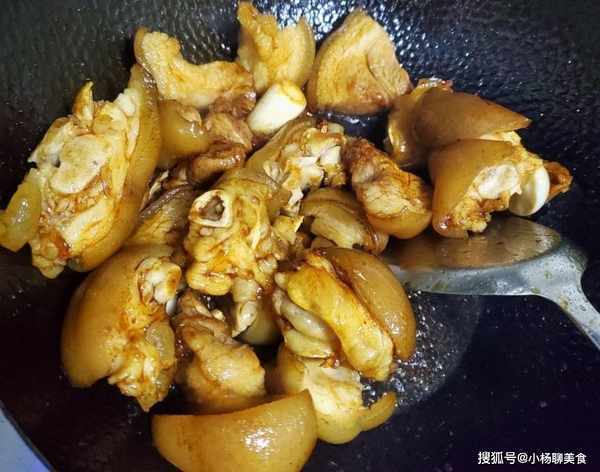 步驟四:起鍋熱油,油熟後放入冰糖,炒出糖色,然後倒入猪蹄炒勻上色。
