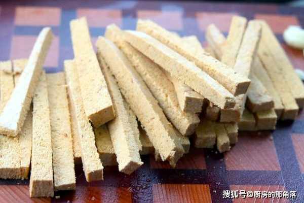 2、豆腐渣1塊,把它表面的白色毛毛擦乾淨,接著切成條狀,可以稍微的切得細一點,這樣的話更容易把鮮味煮出來。