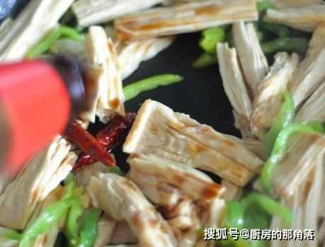 第四步,然後將青椒絲放入鍋中繼續翻炒,待將青椒絲炒至微微發軟的狀態,即可放入幾個幹紅辣椒,當然吃不了太辣的也可以不放,炒香後,即可將擠幹水分的腐竹放入在鍋中;