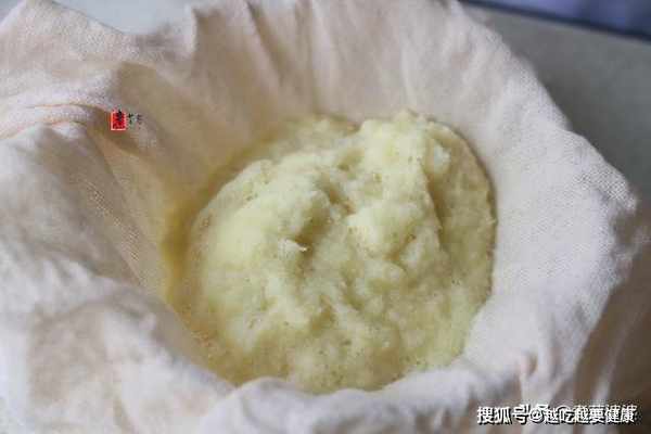 3、將打好的薑汁糊倒入紗布中,擠出裡面的薑汁。