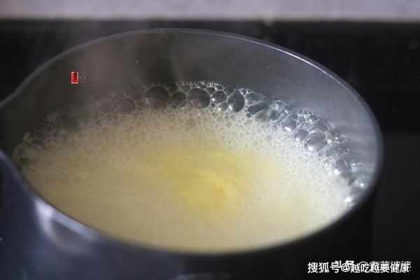4、把過濾好的薑汁倒入奶鍋中,中大火熬煮至沸騰,並繼續熬煮5~6分鐘。