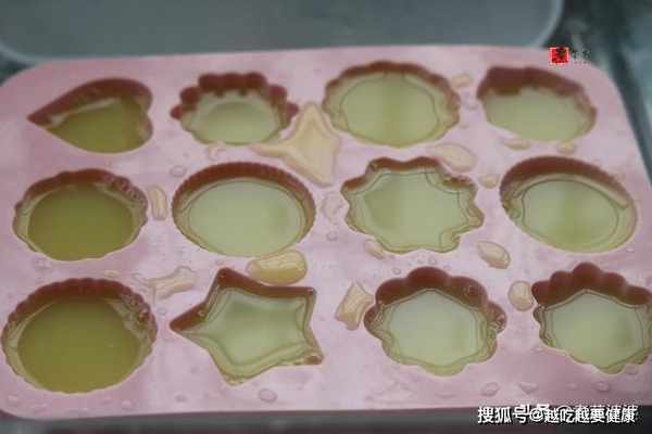 5、關火後,晾溫,將熬煮好的薑汁倒入模具中,蓋上蓋子,放入冰柜中冷凍1夜。