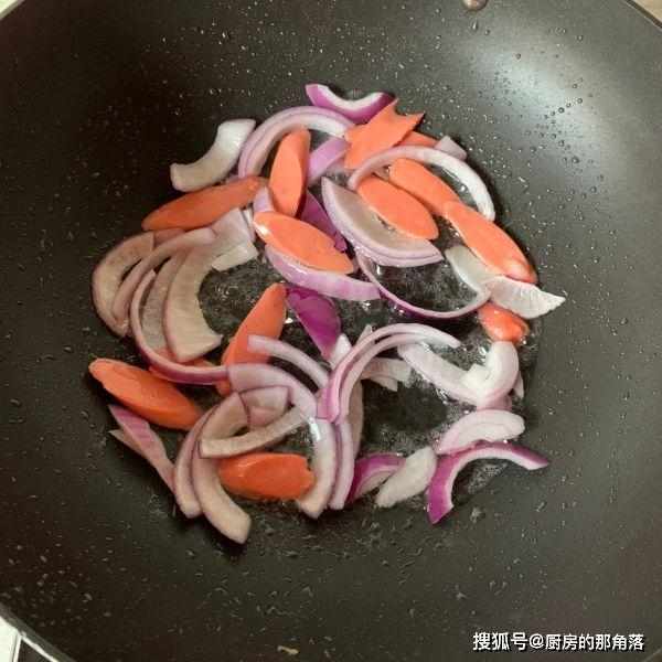 第四步,無需淨鍋,放入適量的食用油。放入洋葱翻炒均勻,待洋葱稍微變軟後,放入火腿片煎至兩面金黃。
