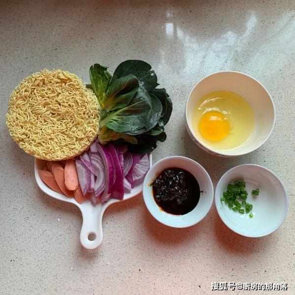 準備食材:速食麵一塊,洋葱半個,火腿腸一根,母雞蛋1枚,老乾媽一勺,上海青一顆,醬油一勺,陳醋一勺,蚝油半勺。