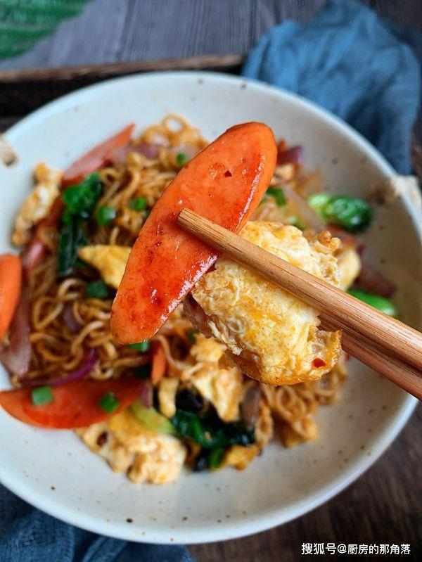 第五步,等待火腿煎至兩面金黃後,放入處理好的麵條,以及上海青翻拌均勻,再加入適量的調料繼續翻炒一分鐘。