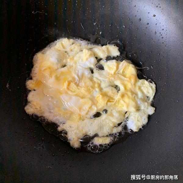 第三步,炒鍋燒熱放入適量的底油,放入攪好的雞蛋液,炒至八分熟即可撈出備用。