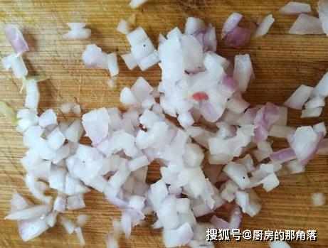 第四步,洋葱清洗乾淨後,切成碎丁,同時紫甘藍和捲心菜切成碎末,芝士切碎;