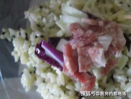 米飯1碗,油適量,鹽適量,芝麻適量,雞蛋1個,紫甘藍適量,捲心菜適量,洋葱適量,培根適量,黑胡椒粉適量,麵包糠適量,沙拉醬適量;