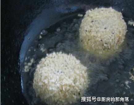 第八步,飯團放在麵包糠中,均勻的包裹上,在鍋中添上油,待油燒至160度的時候,放入飯團;