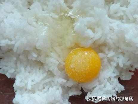 第二步,在剩米飯中,磕入一個雞蛋,戴上手套,將雞蛋和米飯充分的抓勻;