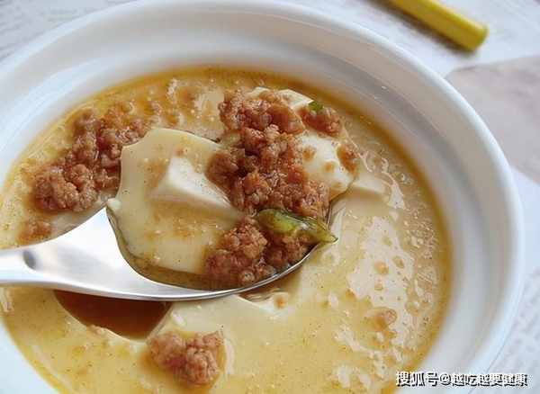2、五分鐘後,咱們將肉餡用勺子取出,均勻地抹在大豆腐上,使其成一個平面。接下來咱們開始上火製作。