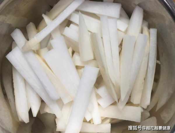 1、蘿蔔不要切得太細或者是太薄了,稍微粗一點的條更好,吃著爽脆入味,蘿蔔不去皮更有脆感,但如果不喜歡帶皮的也可以去掉,事先加上食鹽醃制,是為了殺出水分,這樣的蘿蔔口感更好,更爽脆;