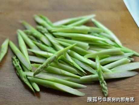 3、蘆筍可以事先下鍋焯下水,記得加上點食鹽,保留其翠綠的色澤,當然了如果覺得焯水麻煩的,便可按照這個方法做,將蘆筍下鍋炒的時候加上點涼白開,效果也是很不錯。
