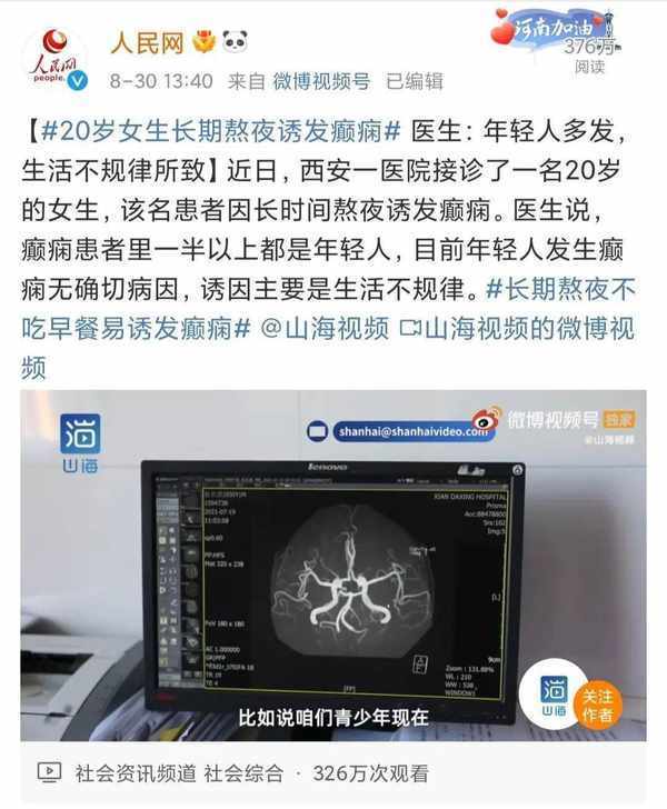 陝西西安某家醫院,接診了一名20歲的女生。該名患者因長時間的熬夜,誘發了癲癇。