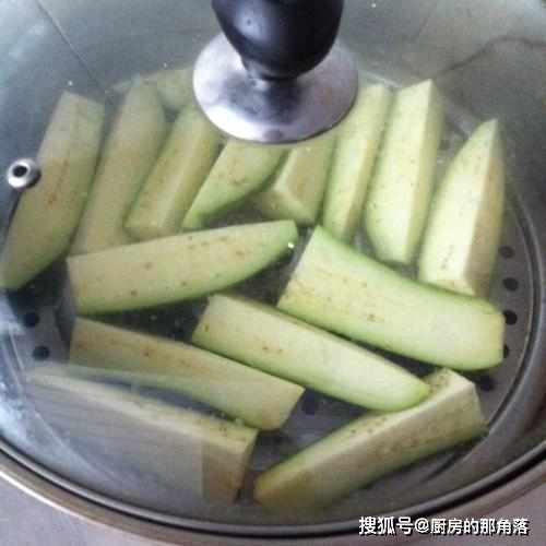 2、接著咱們蒸鍋燒水,水開後,將茄子擺在盤內,放在蒸鍋裏,蒸10分鐘備用,利用這個時間,咱們準備這道菜的料頭。