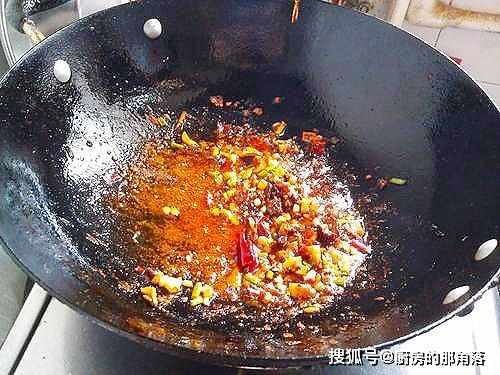 4、接著十分鐘後,咱們將茄子取出,然後鍋燒熱油,將葱薑蒜,泡椒末放入鍋內炒香,炒香後放入郫縣豆瓣醬5克,小火炒出紅油,接著烹入陳醋5克,生抽3克,加入白糖10克。精鹽1克,味精3克,雞精3克調味,加入清水一勺。接著將蒸好的茄子放入鍋內,小火燒至一分鐘,當湯汁漸少時,淋入少許濕澱粉勾芡,即可出鍋裝盤成菜。