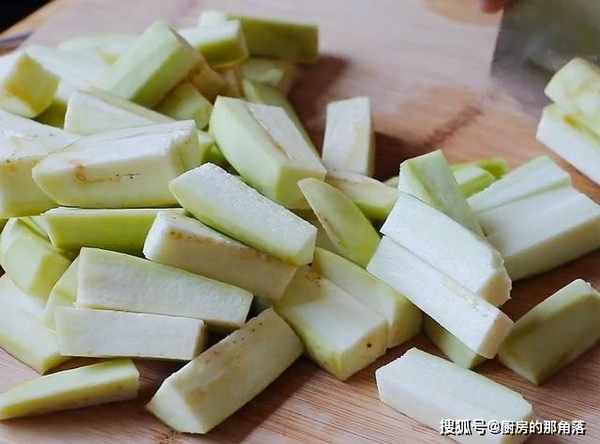 1、首先將新鮮的長茄子兩根去根,然後削掉外皮,接著先將茄子切段,然後頂到切條備用。