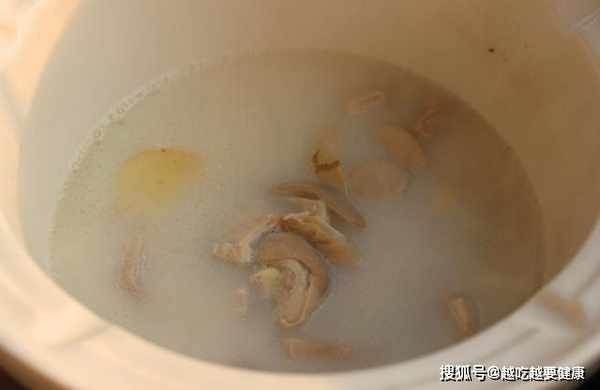 第三步,猪肚放入燉鍋中,加薑片,到滿水,然後開始燉煮,大概2個小時,加些料酒去去腥,等到最後半個小時的時候,加入蓮子,繼續燉,蓮子燉爛後加鹽和雞精調味即可,食用的時候再加胡椒粉。