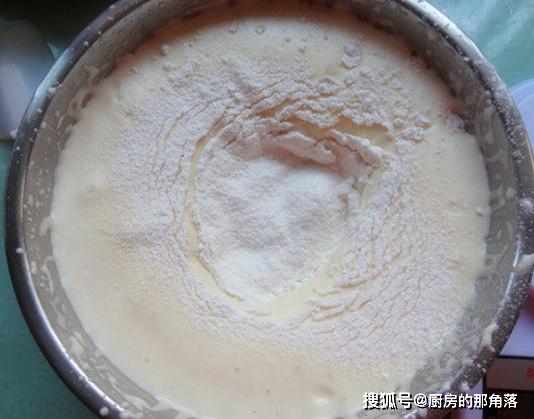 第五步,接著分兩次篩入低筋面粉和泡打粉,翻拌均勻;