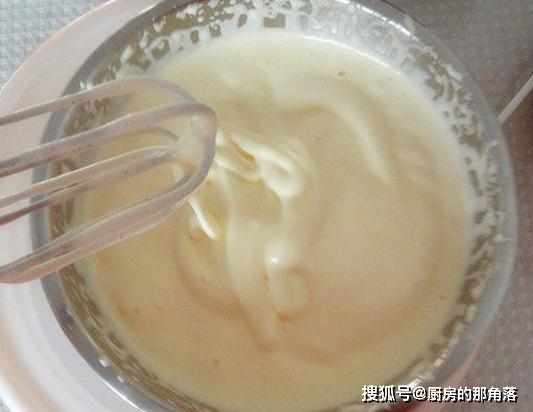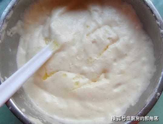 第六步,再加上提前準備好的玉米油,攪拌均勻,將拌好的麵糊裝在裱花袋中;