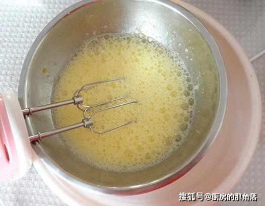 第二步,拿出來一個比之前裝雞蛋液要大的盆,裝上75度的溫水,把雞蛋液的小盆放進去,開啟打蛋器打發,開始我們會發現泡泡很大;