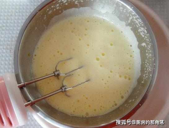 第四步,繼續打發,直至氣泡小時,蛋液變得細膩,提起打蛋頭,落下的液體緩慢的消失,這表示打發好了;