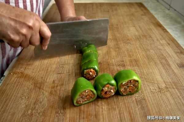 第五步:把裝滿肉餡的辣椒切成大小均勻的小段,放在盤中備用。