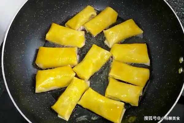 第四步:鍋中倒入油,油稍熱之後將做好的蒜苔卷放進鍋中,全程開小火慢煎,煎至一面呈金黃色然後翻面再煎另一面,煎至兩面都成金黃色出鍋。
