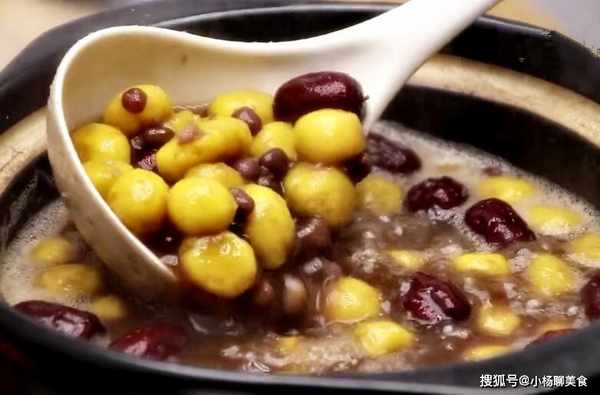 第五步:把泡好的紅豆和紅棗放進砂鍋裏,加入足量的清水,開中火熬煮,二十分鐘後加入提前製作好的糯米球,每個五分鐘用勺子攪拌一下。