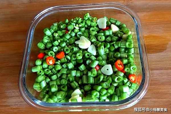 第一步:準備一把豆角擇乾淨之後放在盤中加入一勺鹽浸泡8分鐘之後用清水清洗乾淨,然後瀝幹水分備用。第二步:將瀝幹水分的豆角切成豆角丁放在盆中,一個紅椒用清水洗淨去掉裡面的瓤子用刀切成小塊放在豆角裏,半頭大蒜先拍散再去皮切成蒜塊和它們都放在一起,加入兩勺食鹽,一大勺白糖,一勺香醋,翻拌均勻備用。