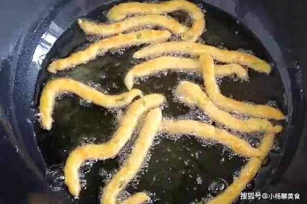 第五步:鍋中倒入油,油溫4成熱的時候,將麵糊擠到鍋中,(大小長短隨意),全程開中小火慢炸,然後用筷子勤翻動,防止粘連在一起,大約炸2-3分鐘左右,看到紅薯條飄起來,就可以控油撈出來了,紅薯糯米條就做好了。