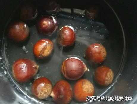 第四步,煮好的栗子,可以發現在劃痕處張開了一個口子,晾至鍋裏的水不燙手;