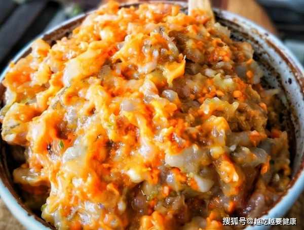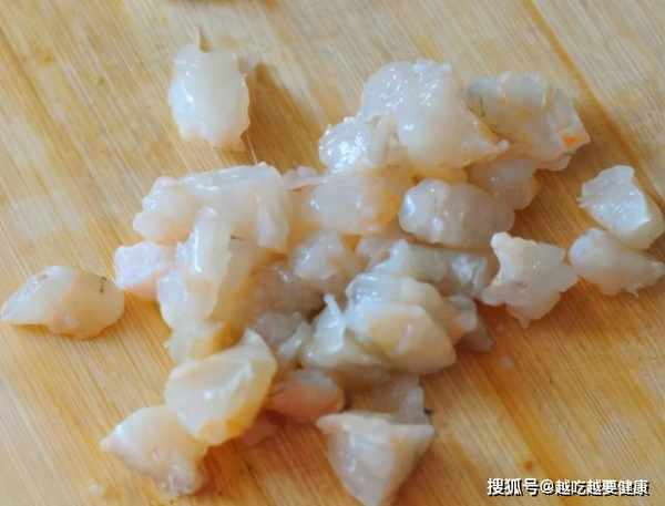 2、胡蘿蔔蝦肉餡可以根據個人的口味調味,我放的調味料比較簡單,更適合小朋友吃,取一部分蝦肉切成丁,是為了吃著更加有嚼感,當然了也可以完全剁成餡用,自行選擇便可;