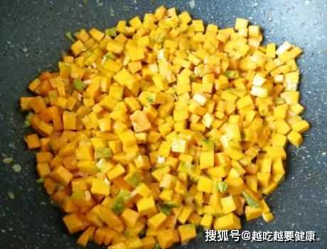 第三步,將其清洗乾淨後,削去皮,去掉瓤,將南瓜切成小碎丁,大葱擇洗乾淨後,控幹水分,切成蔥花,在炒鍋中添上適量的食用油,燒熱後,放入蔥花,煸炒出其中的香味後;