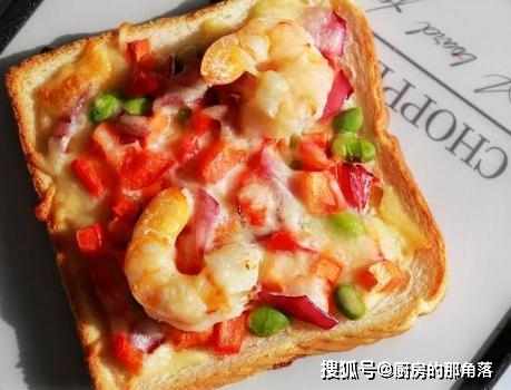 吐司2片,鮮蝦仁適量,火腿腸1根,馬蘇里拉芝士適量,玉米粒少許,豌豆少許,青椒1根,黑胡椒碎少許,番茄沙司少許;