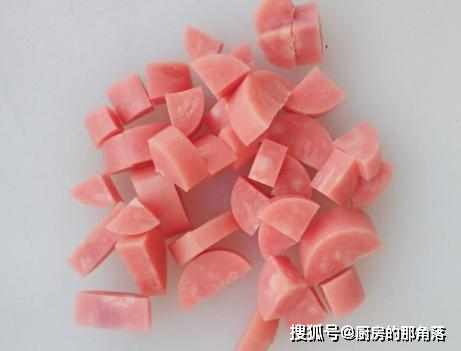 第三步,火腿腸1根,撕去包裝袋,將其切成與青椒粒差不多大小的丁,或者是直接切成圓片也可以,吐司撒上些許的水,放入微波爐中加熱一下,然後取出來,先塗抹一層番茄沙司;