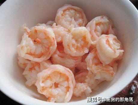 第二步,鮮蝦3個,將其頭尾去掉,同時去掉皮和蝦線,將蝦清洗乾淨,放入在開水鍋中煮一下,待將蝦仁煮至變色的時候,即可從水中撈出來,控幹水分,將其切成塊,稍微大一點也可以;