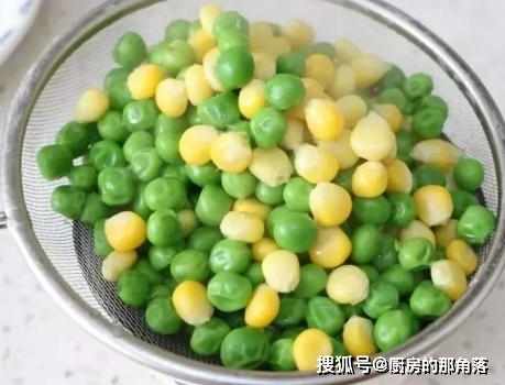 第一步,豌豆和玉米粒準備出適量,在鍋中添上水,放入玉米粒和豌豆煮,將其煮熟後,即可撈出,並且控幹其中的水分待用,青椒1根,去掉根蒂去掉辣椒籽,將其切成丁;