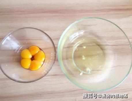 第一步,首先準備出5個雞蛋,差不多是250克重,同時準備出兩個無水無油的容器,將雞蛋的蛋黃和蛋清分離開,分別放入容器中,然後先在盛有蛋黃的容器中加入白糖;