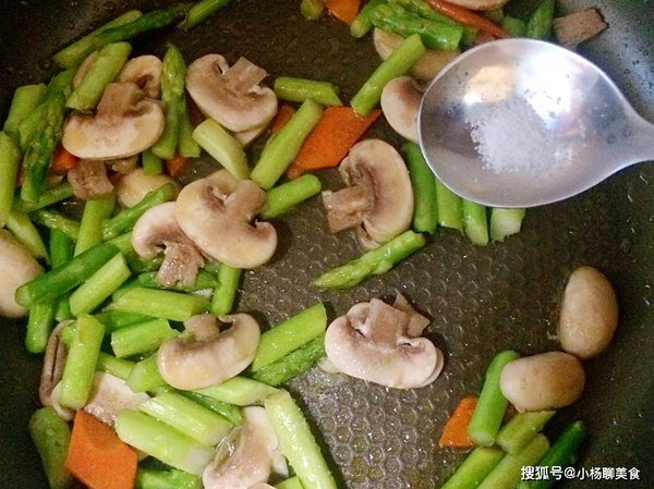 4、炒鍋燒熱,倒入食用油,油熱之後,放入蘆筍和口蘑,翻炒2分鐘左右,加入適量的鹽,即可盛出裝盤。