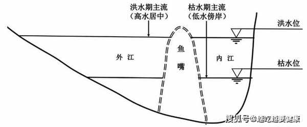 但是當洪水時期的時候,外江的作用就凸顯出來了,這裡凹陷的岸面沖刷凸起的岸面的淤積,所以可以把大量的泥沙帶到外江,這樣就起到了很大的排沙作用。