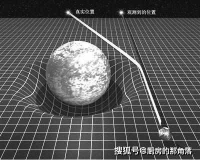 愛因斯坦的廣義相對論也指出了,光線經過大質量的天體會發生彎曲這件事,不過與牛頓用引力來解釋不同,愛因斯坦認為時空的扭曲源於大質量物體壓彎了時空,時空就像一個柔軟的床墊會被壓彎,
